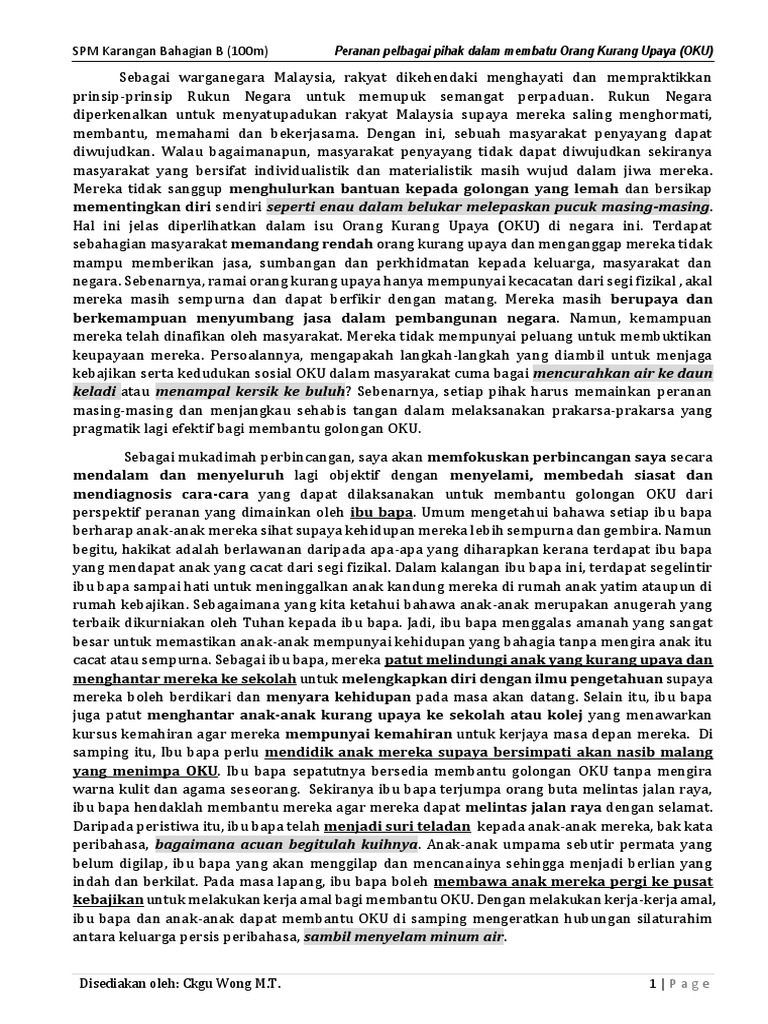 Golongan Orang Kurang Upaya merupakan masyarakat yang perlu diberi layanan yang adil. CONTOH PENULISAN ISI KARANGAN FAKTA. Oleh itu mereka mempunyai kesaksamaan hak dan peluang untuk menjalani kehidupan seperti anggota masyarakat yang lain.